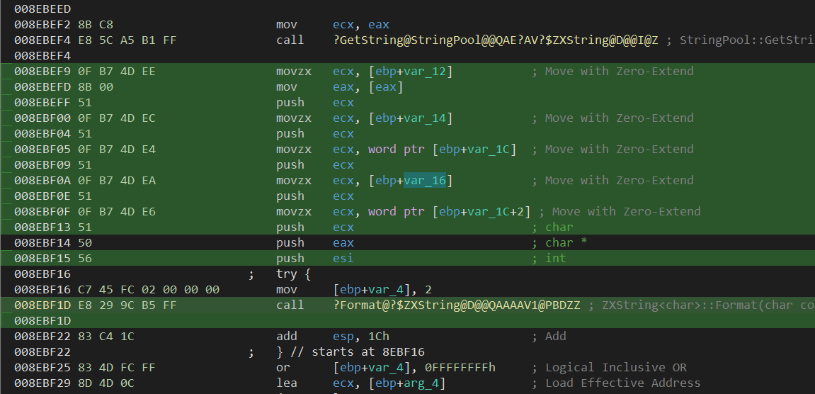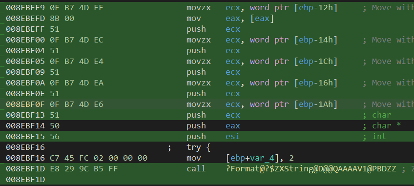 可以看到绿色底色就是和 Format 相关的全部指令,(这里面少标记了push eax 这一行)